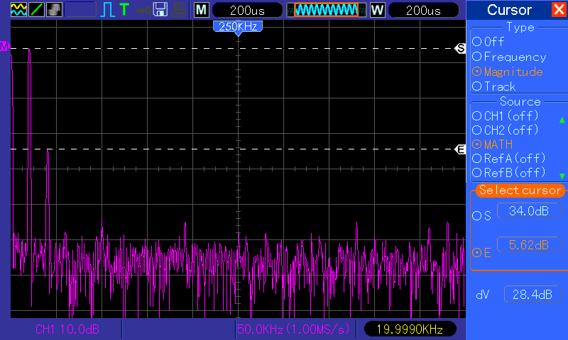 Above in the spectrum analyser you can see with a 1kHz sine, the
