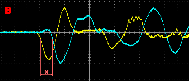 I tapped point "A" and recorded the result on the 'scope, see below;