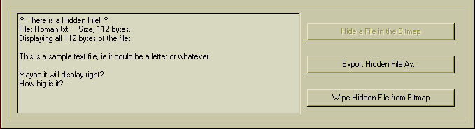 The file to be hidden must be less than 1/4 of the size of the bitmap.