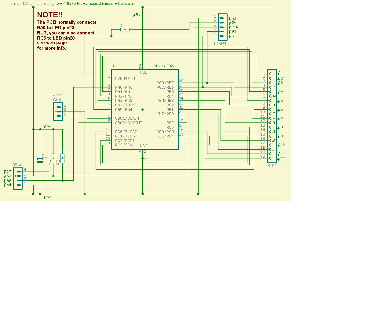 Important! RA0 is to be connected to P20. RC6 and RC7 are the 2 buttons.